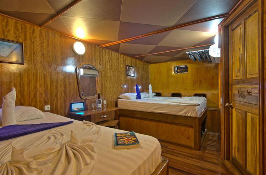 In 12 geräumigen, modernen Kabinen finden 24 Gäste während des Tauchurlaubs mehr als eine komfortable Unterkunft. Jede Kabine besitzt ein Kingsize Doppelbett, ein Einzelbett, einen Schreibtisch, einen großen Kasten ausreichend Stauraum und Klimaanlage. Im eigenen Bad findest du einen Waschtisch, WC und eine Duschkabine.